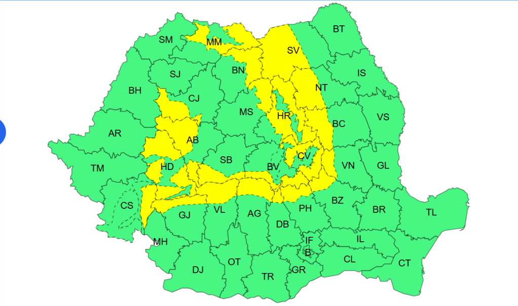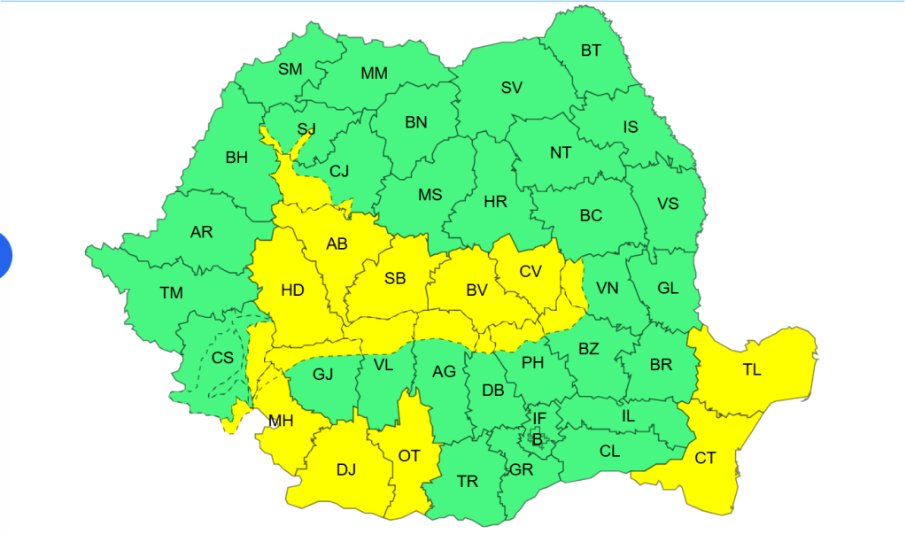 Primul cod galben de intensificări ale vântului este valabil luni, de la ora 12:00, până la ora 22:00. În Dobrogea, vestul și sudul Olteniei, vestul și sudul Transilvaniei, viteza vântului va ajunge la 50…65 de km/h. La munte, vântul va bate până la 70…80 de km/h, iar la altitudini mari vor atinge temporar 90…100 km/h, potrivit ANM.
