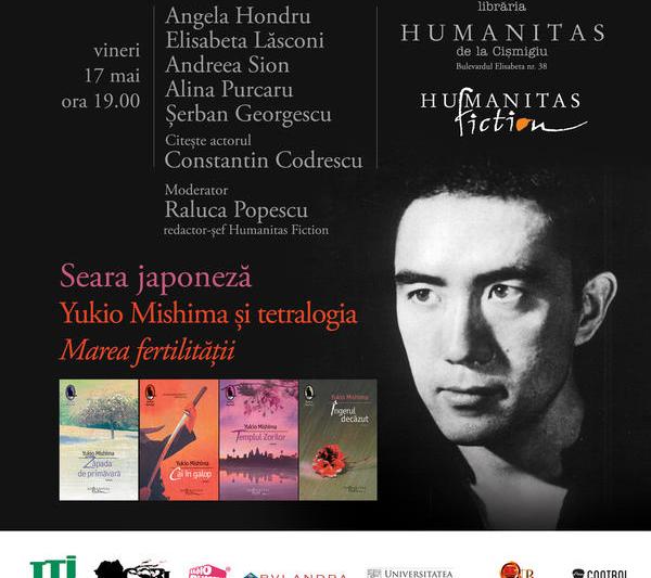 Vineri, 17 mai, incepand cu ora 19.00 va avea loc la Librăria Humanitas de la Cişmigiu (Bd. Regina Elisabeta nr. 38) o seară japoneză dedicată scriitorului Yukio Mishima şi capodoperei sale, tetralogia Marea fertilităţii apărută în colecţia „Raftul Denisei”, colecţie coordonată de Denisa Comănescu la Editura Humanitas Fiction.