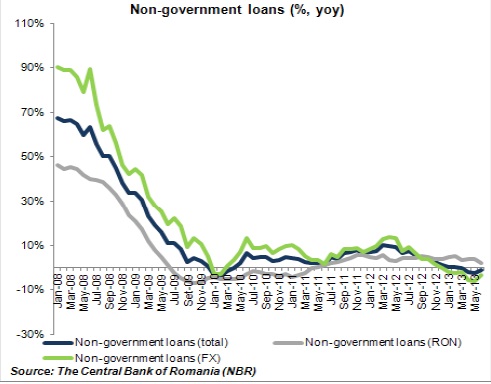 Creditul non-guvernamental s-a contractat in T2 cu 1,9% fata de anul precedent, in timp ce componenta exprimata in lei (reprezentand 38% din soldul total, la sfarsitul lunii iunie) a crescut cu 3,3% fata de anul precedent (cel mai mic ritm din T3 2011);
