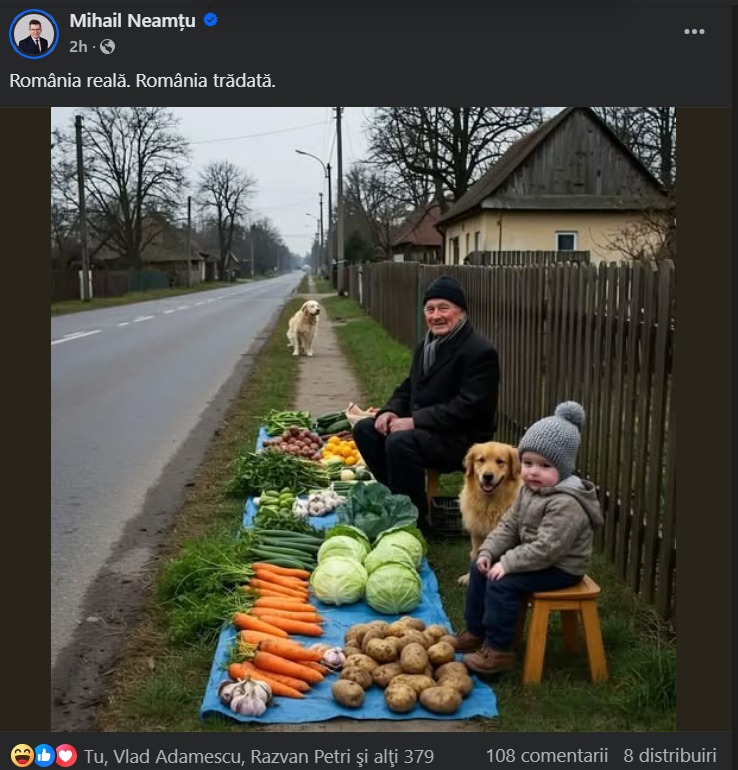 Mihail Neamțu a postat, miercuri, pe rețeaua de socializare textul „România reală. România trădată”, care însoțește o fotografie generată cu inteligența artificială cu un bătrân și un copil care vând legume în fața unei porți. Mai mulți utilizatori au reacționat la postarea deputatului, lăsând comentarii ironice. Întrebat de HotNews.ro dacă a verificat autenticitatea pozei, Neamțu a răspuns: „Nu, am găsit-o pe X și mi-a plăcut”.