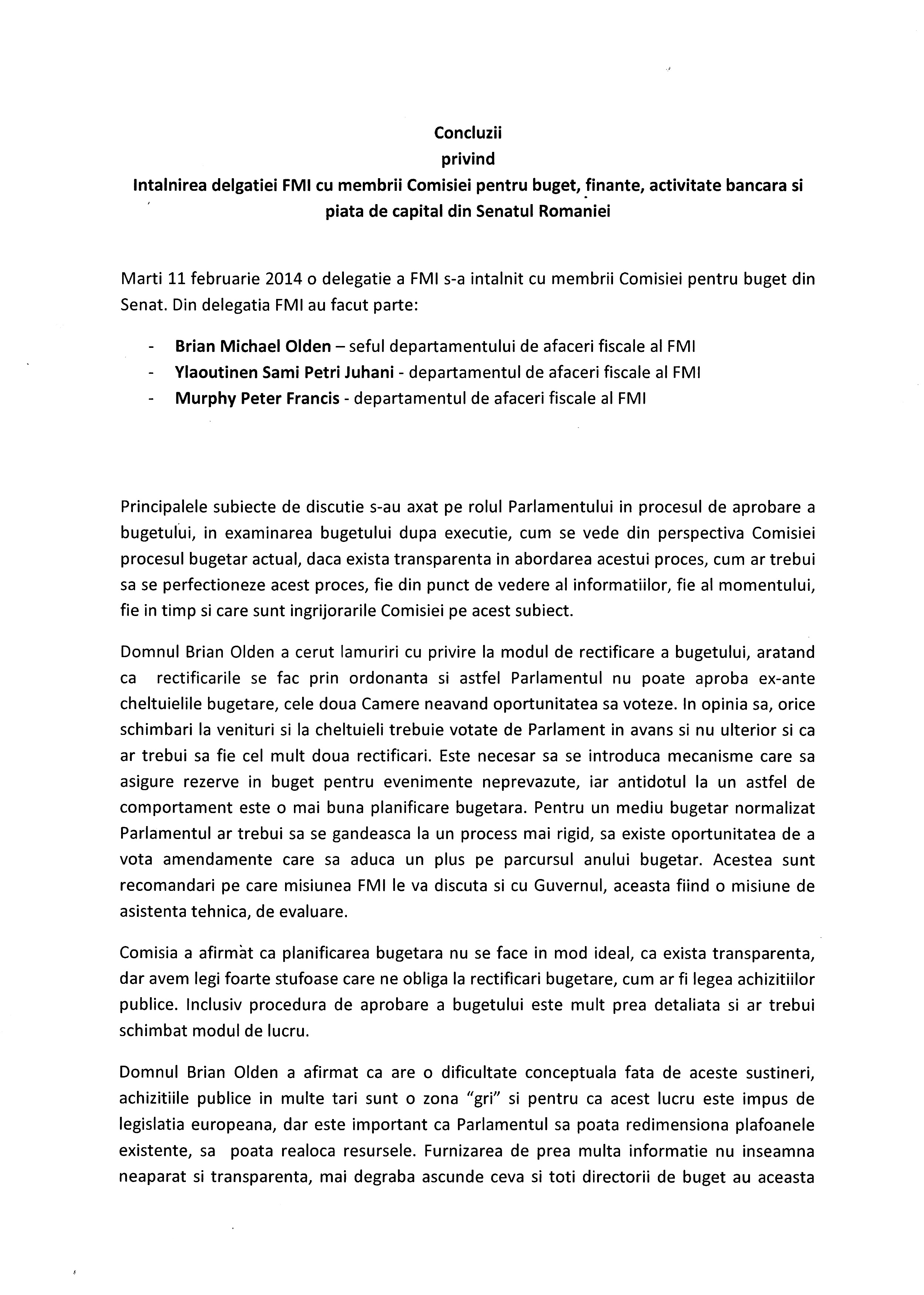 Concluzii privind Intalnirea delgatiei FMI cu membrii Comisiei pentru buget, finante, activitate bancara si piata de capital din Senatul Romaniei. Marti 11 februarie 2014 o delegatie a FMI s-a intalnit cu membrii Comisiei pentru buget din Senat. Din delegatia FMI au facut parte: