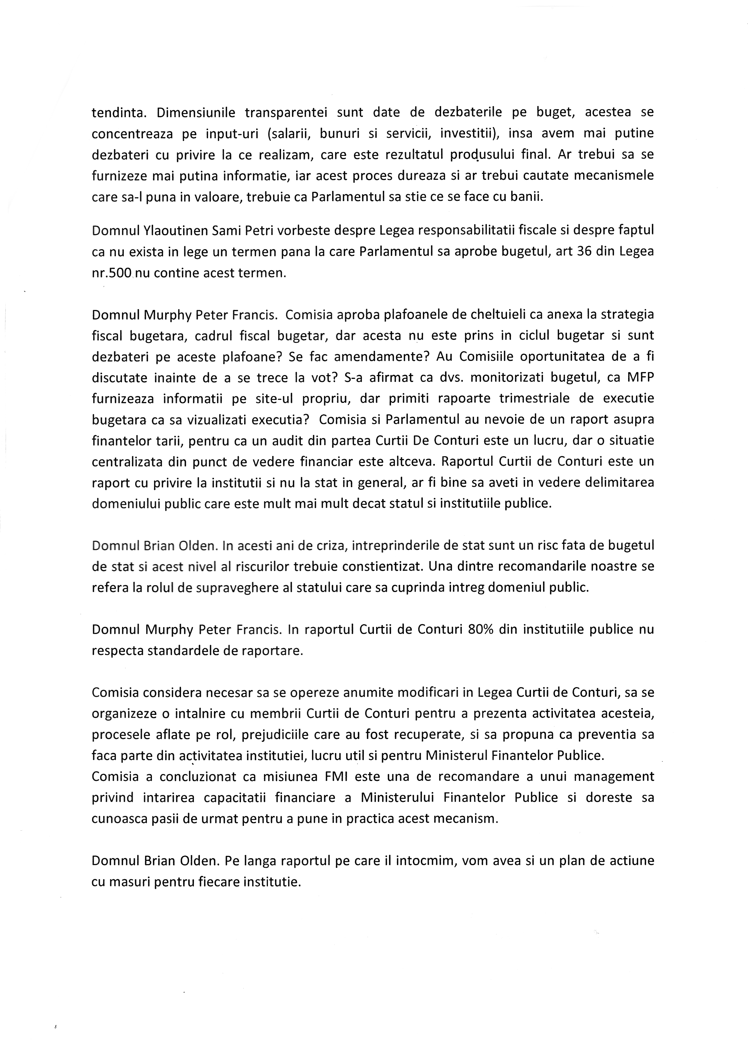 Domnul Brian Olden a cerut lamuriri cu privire la modul de rectificare a bugetului, aratand ca rectificarile se fac prin ordonanta si astfel Parlamentul nu poate aproba ex-ante cheltuielile bugetare, cele doua Camere neavand oportunitatea sa voteze. In opinia sa, orice schimbari la venituri si la cheltuieli trebuie votate de Parlament in avans si nu ulterior si ca ar trebui sa fie cel mult doua rectificari. Este necesar sa se introduca mecanisme care sa asigure rezerve in buget pentru evenimente neprevazute, iar antidotul la un astfel de comportament este o mai buna planificare bugetara.