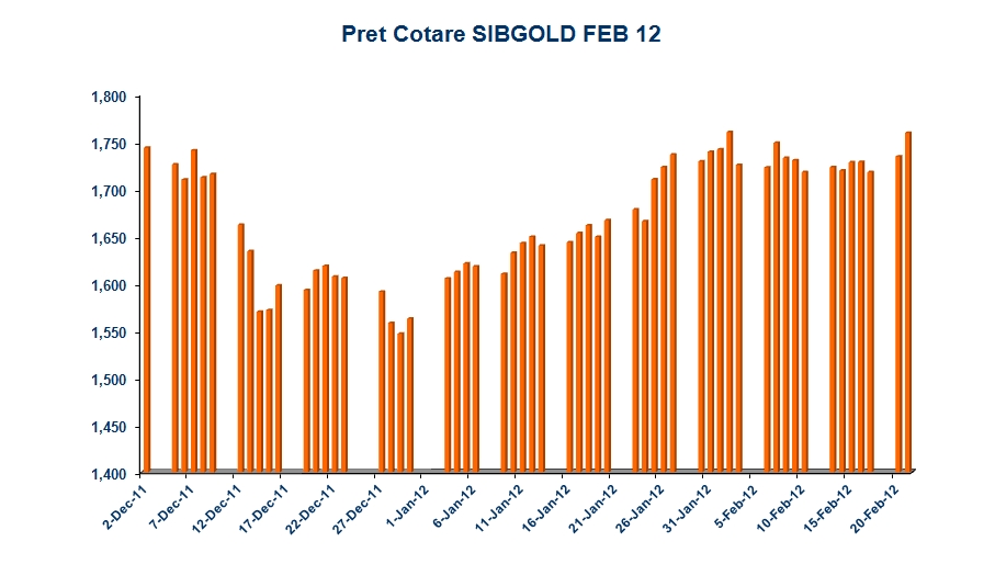 In sedinta de miercuri s-au tranzactionat 41.898 contracte futures, cu o valoare de 178, 2 milioane de lei, depasindu-se recordul din ianuarie 2012, cand Bursa din Sibiu anunta cel mai bun volum din ultimii patru ani. Pretul aurului a crescut puternic in acest an, cu peste 200$, de la 1562,7$ cotatia ultimei zile din 2011, pana la 1777,2$, cotatie stabilita miercuri seara la ora 23.15.