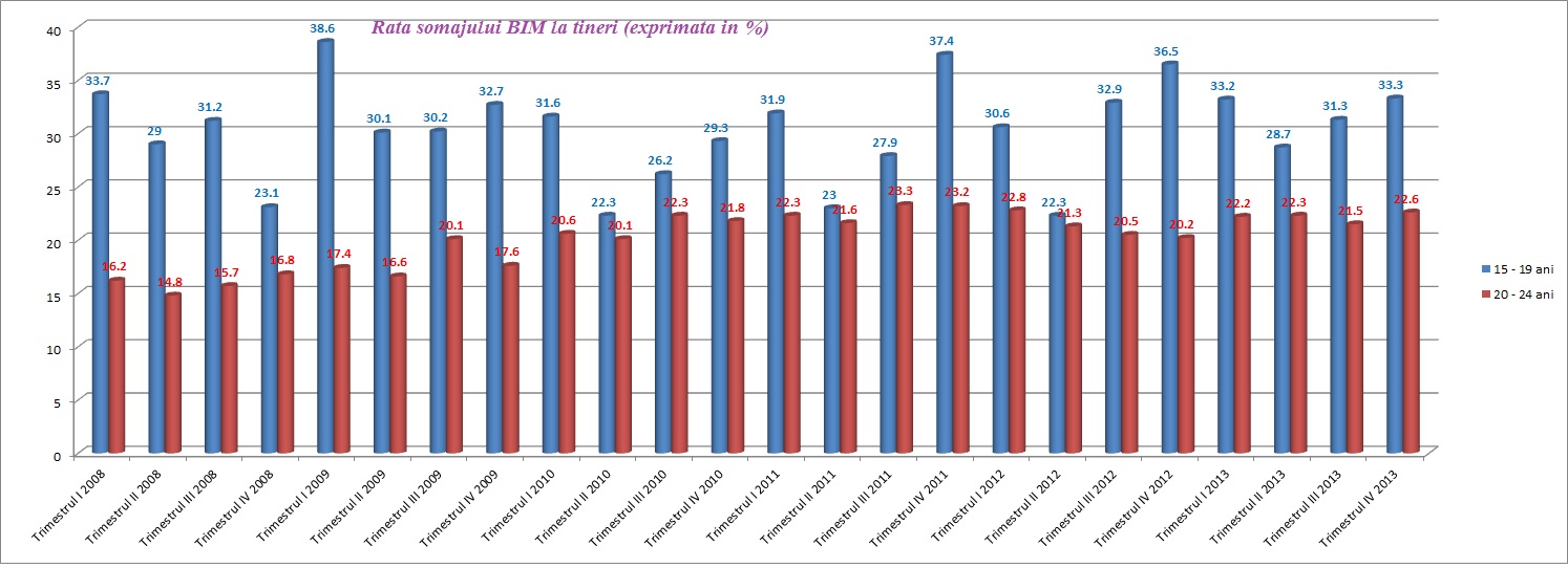 In luna iulie 2014, rata somajului in forma ajustata sezonier a fost estimata la 7,0%, aflandu-se in scadere cu 0,1 puncte procentuale fata de luna anterioara si cu 0,3 puncte procentuale fata de nivelul inregistrat in luna iulie 2013, a transmis vineri Institutul National de Statistica. Numarul somerilor (in varsta de 15-74 ani), estimat pentru luna iulie din anul curent este de 698 mii persoane, in scadere atat fata de luna precedenta (700 mii persoane) cat si fata de aceeasi luna din anul precedent (726 mii persoane). Pe sexe, rata somajului pentru barbati o depaseste cu 1,5 puncte procentuale pe cea a femeilor (valorile respective fiind 7,7% in cazul persoanelor de sex masculin si 6,2% in cazul celor de sex feminin). Drama cea mai mare e la somajul in randul tinerilor.