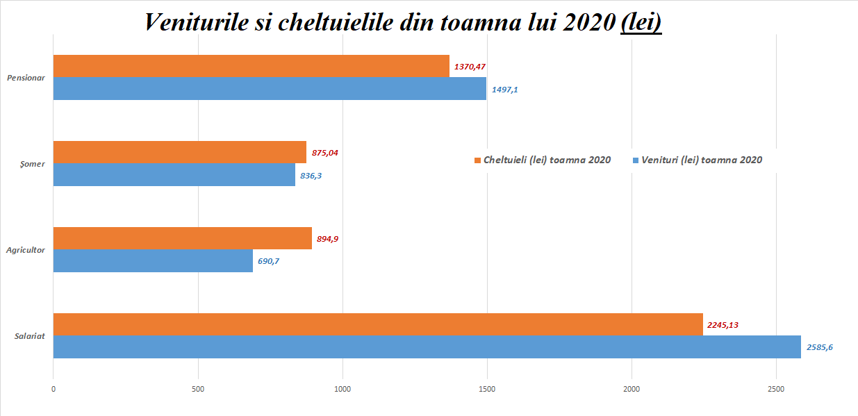 Veniturile bănești din toamna anului trecut au fost mai mici decât cheltuielile în cazul agricultorilor și șomerilor, arată datele publicate luni de Institutul Național de Statistică. Spun venituri ”bănești” deoarece INS ia în calcul la capitolul de venituri și pe cele din agricultură sau din activități independente, nu doar salariile. Potrivit datelor INS, veniturile totale lunare au fost în medie în trimestrul III 2020, de 5302 lei pe familie şi 2068 lei pe persoană. Cheltuielile populaţiei au fost în aceeași perioadă de 4444 lei lunar pe gospodărie (1733 lei pe persoană).