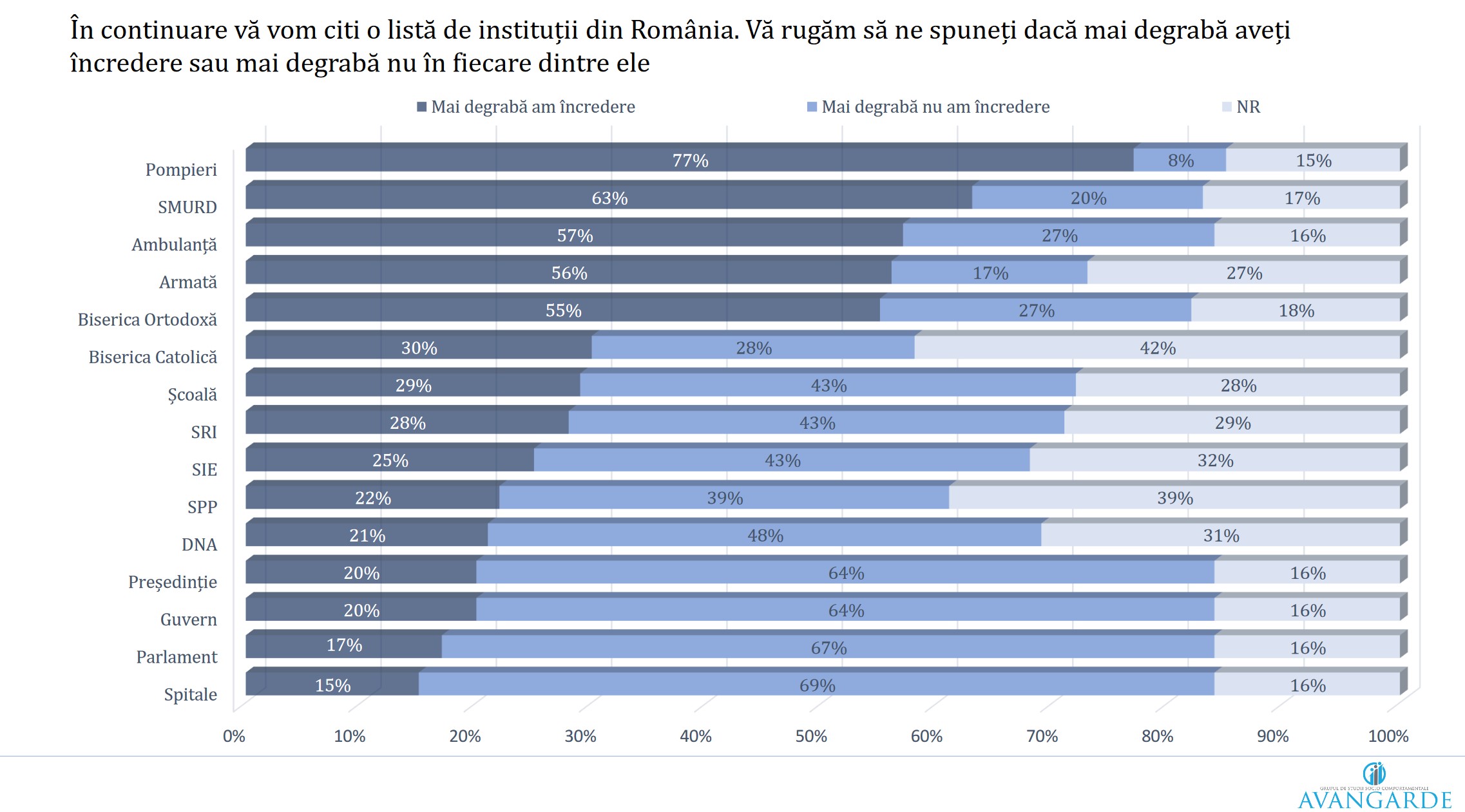 Tot la coada clasamentului se situează Parlamentul (17%), Guvernul și Președinția, cu 20%.