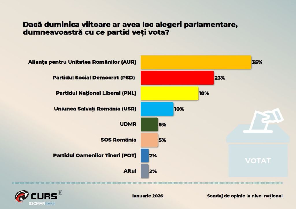 Sondajul CURS din decembrie punea AUR la 35% din voturi, urmat de PSD 22%, iar PNL cu 19%. USR ar obține 9%, în timp ce UDMR și SOS România sunt cotate fiecare cu 5%.