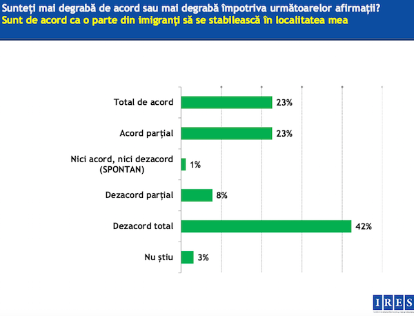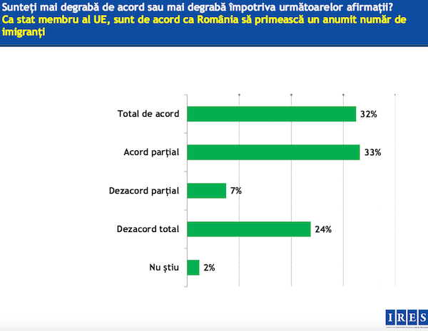 65% dintre respondenti sunt de acord total sau partial ca Romania sa primeasca un anumit numar de imigranti in calitate de membru UE. Insa atunci cand sunt intrebati de posibilitatea ca refugiatii sa se mute chiar in localitatea lor, procentul celor care sunt de acord cu acest lucru scade la 46%, iar 42% sunt in total dezacord cu aceasta ipoteza, precizeaza institutul.