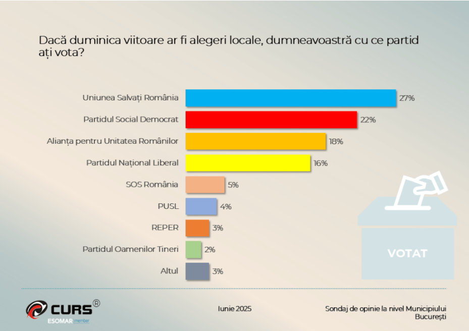 Un procent de 27% dintre bucureșteni ar vota USR, dacă duminica viitoare ar fi alegeri locale, arată un sondaj de opinie al CURS. Pe locul doi se clasează PSD, iar pe trei este – AUR. PNL se află pe poziția patru, cu 16%.
