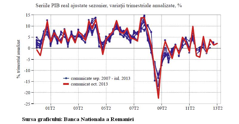 Evolutia PIB a cunoscut revizuiri semnificative si variate ca directie si magnitudine, arata si BNR intr-un studiu destinat tocmai acestor revizuiri. De asemenea, se mai spune in studiu, au existat cazuri in care a fost schimbat si semnul ratei de crestere trimestriale anualizate: de exemplu, comunicatele initiale plasau cresterea economica pentru 2009 T3 intre -3 la suta si -2 la suta, insa cel mai recent comunicat (octombrie 2013) indica o crestere trimestriala de circa 4 la suta pentru acea perioada.