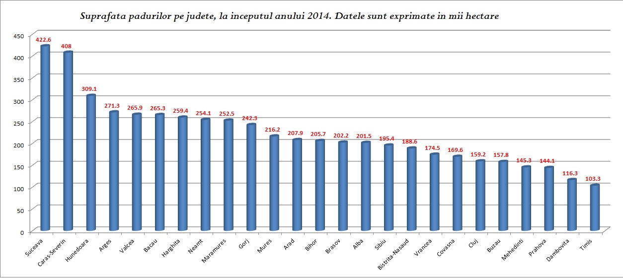 Mures, Vrancea si Gorj sunt judetele in care suprafetele padurilor au scazut cel mai mult fata de 2008. Muresul a inregistrat o scadere cu peste 5.000 de hectare de padure, in vreme ce in Vrancea s-au taiat peste 3.000 de hectareiar in Gorj, 2100 de hectare. Alba si Maramures sunt urmatoarele judete in topul taierilor de padure in intervalul 2008-2014, cu cate peste 1.000 de hectare in fiecare judet. Potrivit unui anunt facut miercuri de Institutul National de Statistica, suprafata fondului forestier la 31 decembrie 2014, comparativ cu aceeasi data a anului 2013, a inregistrat o crestere de aproximativ 0,1%. Aceasta crestere se datoreaza in principal unor reamenajari de pasuni impadurite si introducerii in fondul forestier a terenurilor degradate si a terenurilor neimpadurite, stabilite a fi impadurite.