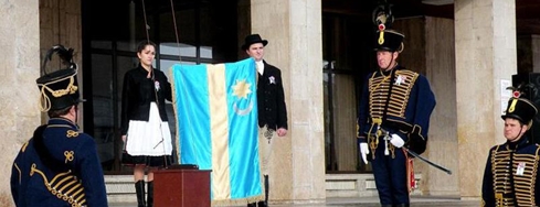 In spatele prodecanului, se vede cladirea Consiliului Judetean. Pe cladire, steagul alb-albastru falfaie alaturi de cel romanesc de cativa ani buni fara sa-l fi bagat cineva in seama in afara de romanii verzi, mereu vigilenti cu tot ce misca.