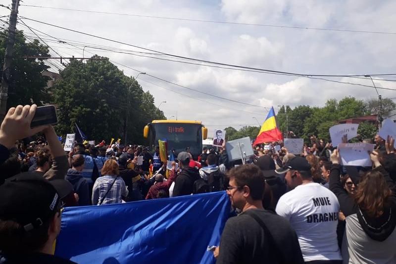 VIDEO Două autocare ale susținătorilor PSD au fost blocate de către protestatari la Galați / S-a scandat ”PSD, ciuma roșie”