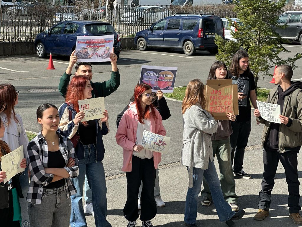 Ei au venit și cu pancarte. „Nu vrem extreme în facultate, vrem transparență și egalitate”, „Suntem studenți antifascism!” și „Pacea nu se câștigă cu minciuni. SNSPA, treziți-vă!”, mai scandează tinerii.