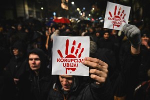 În Belgrad, Nis şi Novi Sad, printre alte oraşe, studenţii au blocat intersecţiile şi au afişat bannere cu o mână însângerată, simbolul a ceea ce cred ei: că guvernul sârb are mâinile pătate de sânge din cauza corupţiei endemice şi a clientelismului.