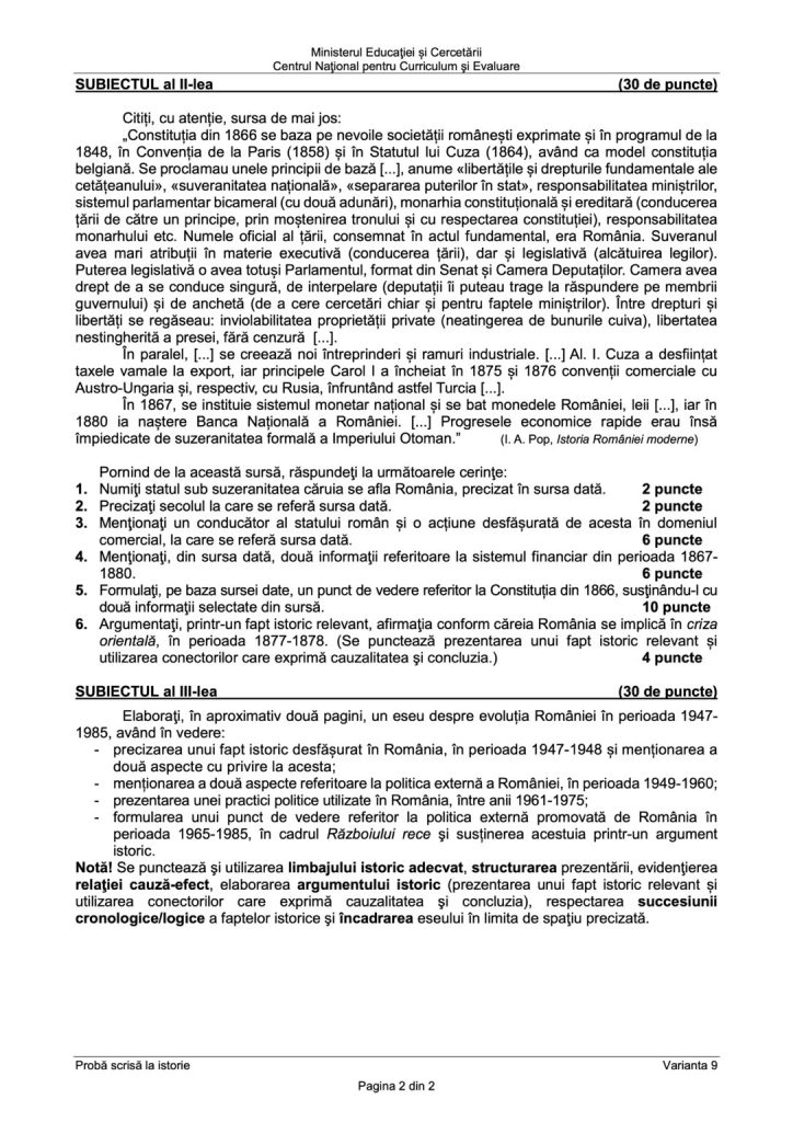 La subiectul II, au avut de rezolvat cerințe legate de Constituția din 1866 și măsurile de modernizare a României în a doua jumătate a secolului XIX, incluzând reforme, instituții și implicarea în criza orientală din 1877-1878.
