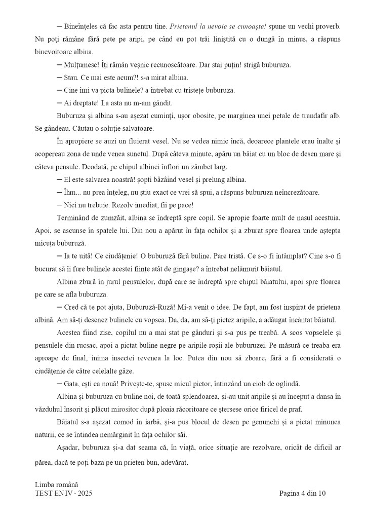 Elevii de clasa a IV-a au susținut marți, 20 mai 2025, proba scrisă la Limba română la Evaluarea Națională 2025. Ei au avut la dispoziție 60 de minute pentru a răspunde la întrebări bazate pe un text intitulat „Buburuza fără buline”, semnat de autoarea Claudia Groza.