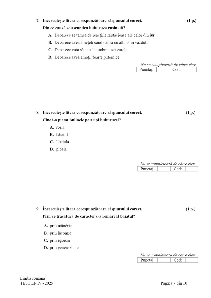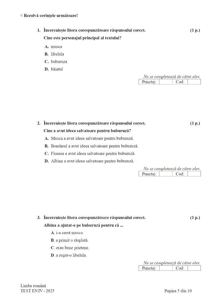 Potrivit Edupedu.ro, care a publicat subiectele de la Evaluarea Națională 2025 la clasa a IV-a, textul a fost urmat de mai multe cerințe de înțelegere a mesajului, de redactare și de exprimare personală. Printre cerințe s-au numărat: