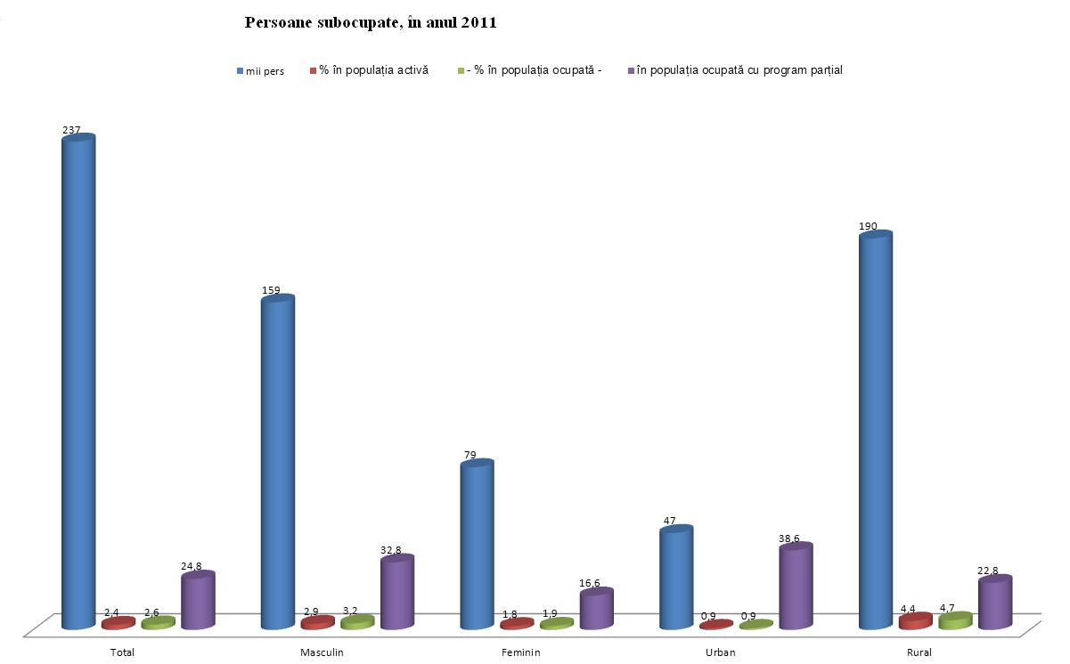 In anul 2011, 237.000 de romani ocupati cu program partial doreau si erau disponibili sa lucreze mai multe ore decat in prezent, fiind considerate persoane subocupate, anunta INS. Aceasta categorie de persoane a reprezentat 2,4% din populatia activa, 2,6% din populatia ocupata si aproape un sfert (24,8%) din numarul total al persoanelor care lucrau cu program de lucru partial. La nivelul UE27, 3,6% dintre persoanele active erau subocupate in anul 2011. Cele mai mari ponderi ale persoanelor subocupate in randul populatiei active s-au inregistrat in Irlanda (6,3%), Marea Britanie (5,6%) si Germania (4,7%), iar cele mai mici in Republica Ceha (0,5%), Belgia si Bulgaria (0,8% – ambele).