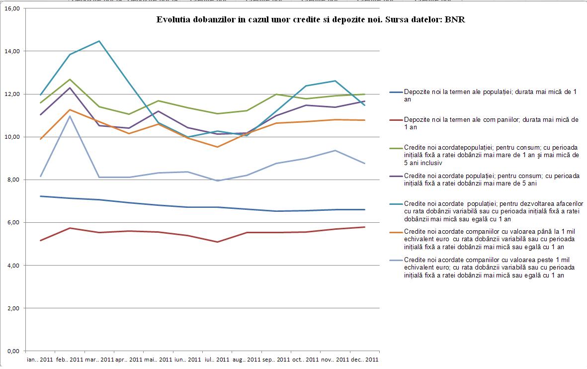 Mai sus aveti evolutia dobanzilor la creditele si depozitele noi. Din grafic puteti vedea la care dintre credite si respectiv depozite au urcat dobanzile (sau au scazut, dupa caz). De remarcat rigiditatea cu care reactioneaza bancile comerciale la semnalele transmise de BNR.