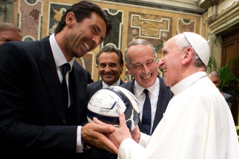 Papa Francisc, Gianluigi Buffon (stânga), președintele Federației Italiene de Fotbal Giancarlo Abete și antrenorul echipei naționale a Italiei Cesare Prandelli în timpul unei audiențe la Vatican. Sursă foto: Ossromano / Zuma Press / Profimedia