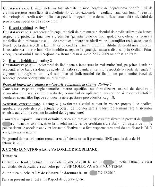 Asta inseamna risc mediu spre ridicat. „Pana in prezent institutia de credit nu a procedat la reevaluarea tuturor bunurilor imobile acceptate in garantie. Masura dispusa prin Ordinul Prim- viceguvernatorului Bancii Nationale a Romaniei (Florin Georgescu) numarul 414/22.12.2009 nu a fost realizata (controlul a avut loc la finele lui decembrie 2010- n.m. DP)”, se arata in Raportul de control (vezi aici documentul).