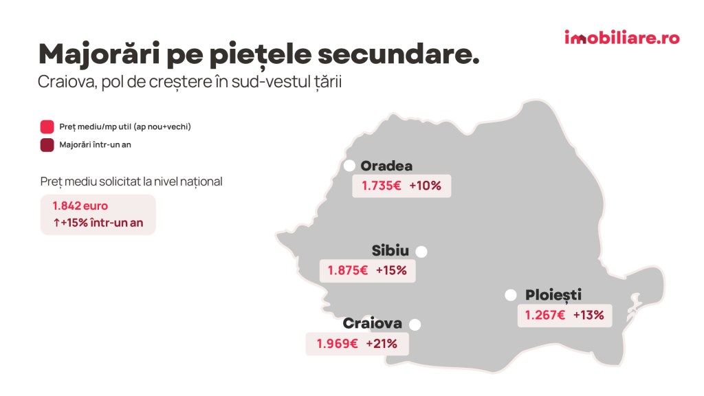 - Scumpiri cu cel puțin 10% au putut fi observate și pe piețele rezidențiale secundare din țară. Craiova se evidențiază nu doar cu un preț mediu care îl depășește pe cel practicat în orașe precum Iași sau Constanța, ci și printr-o majorare cu 21% a acestuia într-un singur an.