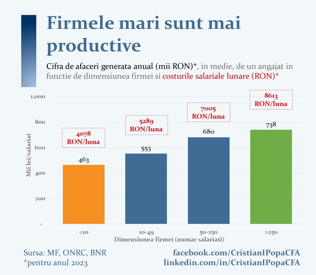 Concret, un angajat dintr-o firmă mare produce, în medie, cu 60% mai multă cifră de afaceri decât unul dintr-o microîntreprindere. Asta nu înseamnă că firmele mici sunt ineficiente. Creșterea constantă a productivității de la micro la macro se datorează, printre altele, economiilor de scară (costurile fixe sunt răspândite pe un număr mai mare de unități produse sau servicii oferite, ceea ce permite companiilor mari să investească în tehnologie și să automatizeze procesele, sporind eficiența), a accesului la piețe mai mari și accesului mai facil la capital, fie prin bănci, fie prin piețele de capital. Acest cumul de factori permite extinderea operațiunilor, tehnologizarea și atragerea forței de muncă mai bine pregătită și mai bine remunerată. Nu întâmplător, companiile mai productive per salariat își recompensează mai bine angajații.