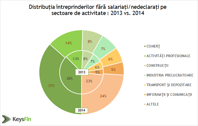• Procentul acestora este in scadere cu 0,69% fata de anul 2013, atunci cand business-ul firmelor fara angajati a fost de 43,9 miliarde lei.