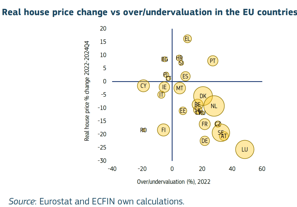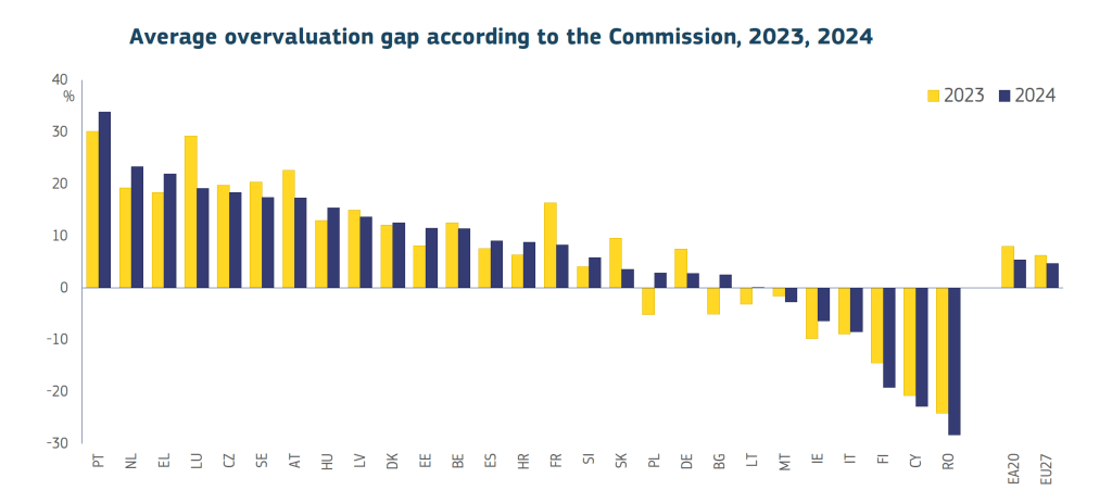 La sfârșitul anului 2024, prețurile locuințelor au rămas supraevaluate în multe state membre ale UE, în ciuda reducerii recente a decalajelor de evaluare. Conform celor mai noi date disponibile, Comisia estimează că supraevaluarea cea mai mare se înregistrează în Portugalia, unde prețurile sunt cu circa 35% peste nivelurile fundamentale. Este singura țară în care supraevaluarea a continuat să crească în 2024.