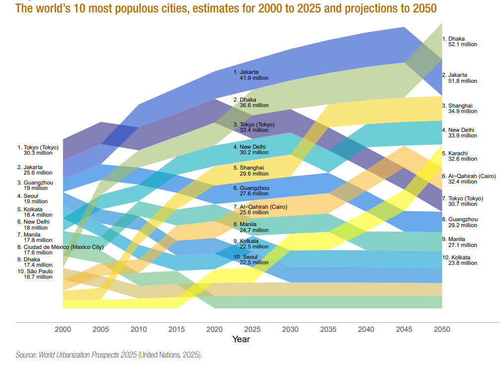 Numărul megalopolisurilor – definite ca orașe cu cel puțin 10 milioane de locuitori – s-a mărit semnificativ, de la opt în 1975 la 33 în 2025.