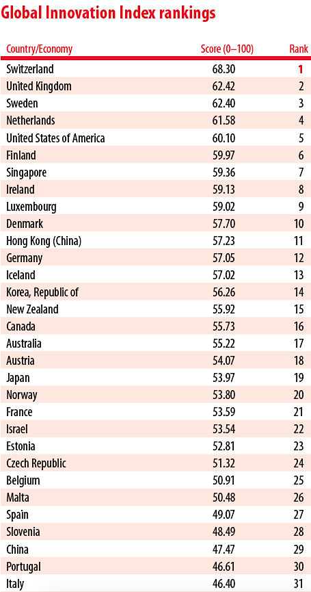 Alte surprize vin din partea Chinei (locul 29) si a Malaeziei (32), noteaza autorii studiului, potrivit carora performanta lor este similara celei inregistrate de tarile din top 25 in domenii ca dezvoltarea capitalului uman si finantarea cercetarii si dezvoltarii.