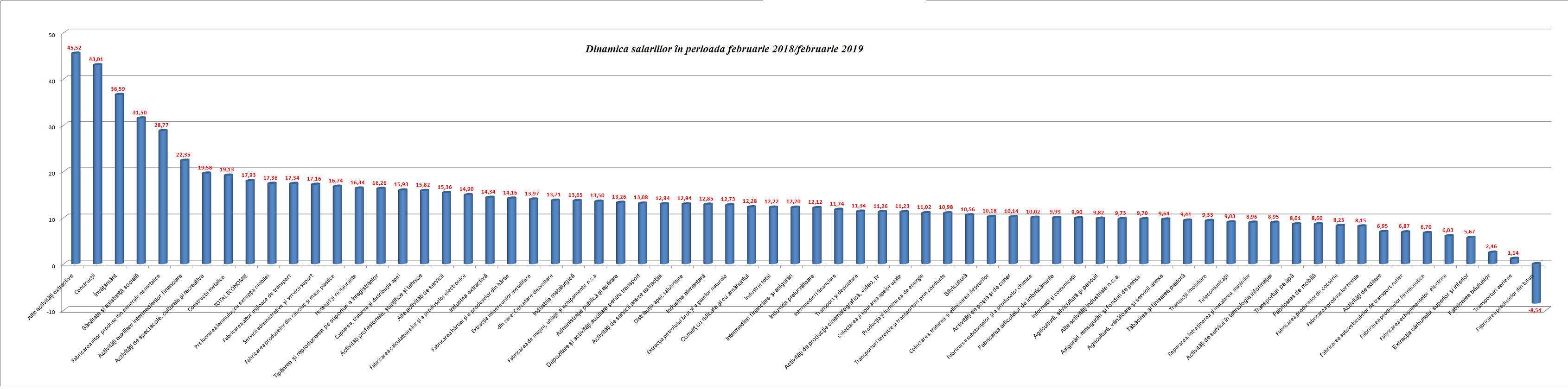 Salariile celor din construcții și din domenii conexe construcțiilor au urcat în februarie cu peste 40% în ritm anual, potrivit datelor transmise luni de reprezentanții Institutului Național de Statistică. Următoarele cele mai mari creșteri le au salariații din Învățământ și Sănătate, unde creșterile depășesc 30%. Salariul mediu net din februarie a fost de 2.933 de lei.