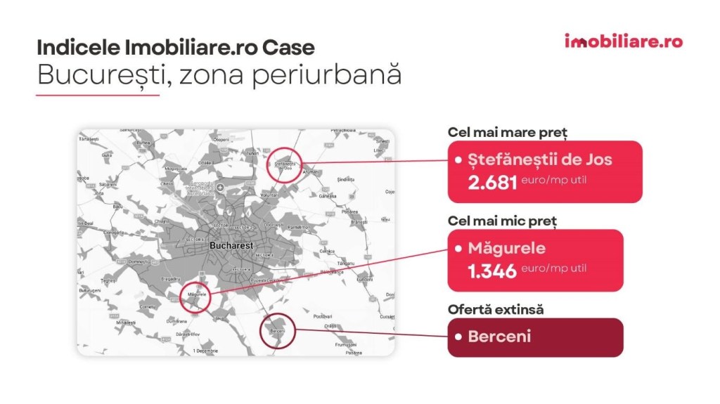 În cazul localităților situate în zona periurbană a Bucureștiului, majorările au fost, în același interval de timp, semnificative, mai exact cu 17%. Casele au fost listate la vânzare de proprietari și dezvoltatori cu un preț mediu de 1.723 euro/mp util, potrivit Indicelui Imobiliare.ro Case.