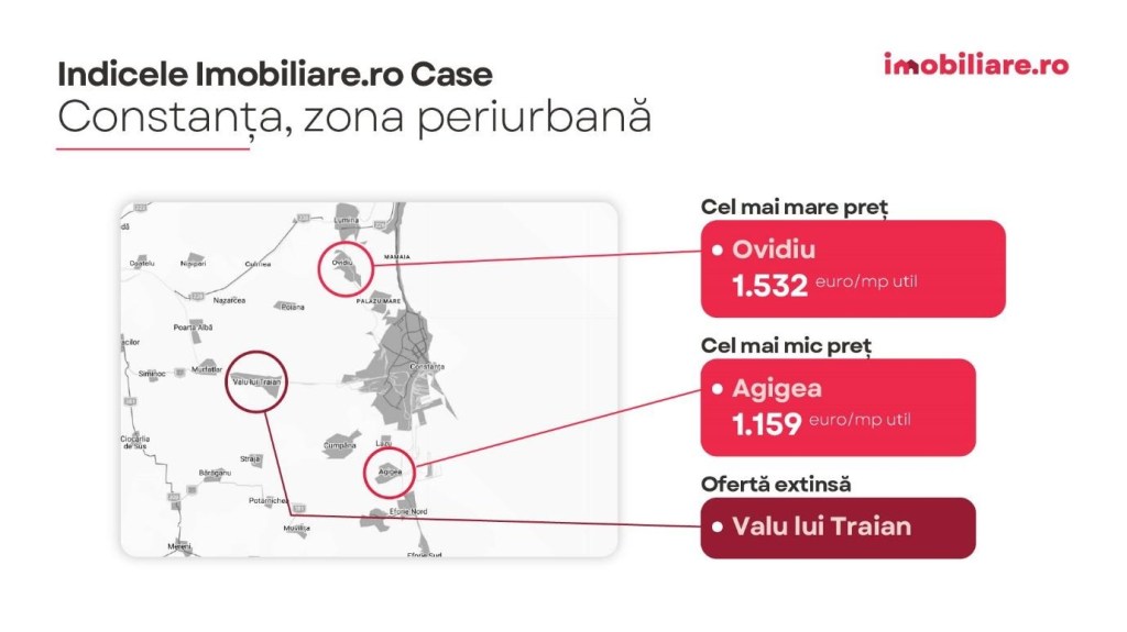 Proprietățile din Constanța sunt scoase la vânzare cu un preț mediu de 1.875 euro/mp util, potrivit Indicelui Imobiliare.ro Case aferent lunii martie. În apropierea orașului, cumpărătorii au acces la oferte mult mai accesibile, dacă își concentrează căutările în comunele Lumina și Agigea. În acest caz, prețurile se mențin sub pragul de 1.200 euro/mp util.