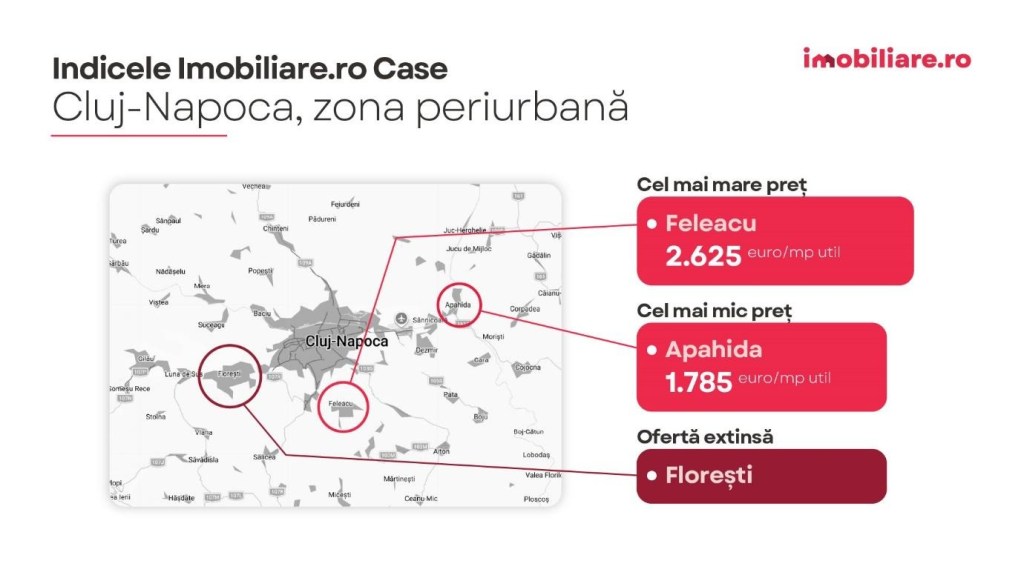 Cumpărătorii care își doresc să achiziționeze o casă în zona periurbană a Clujului la un preț cât mai mic trebuie să-și orienteze căutările spre proprietățile din Apahida. Luna trecută, acestea se vindeau în medie cu 1.785 euro/mp util.