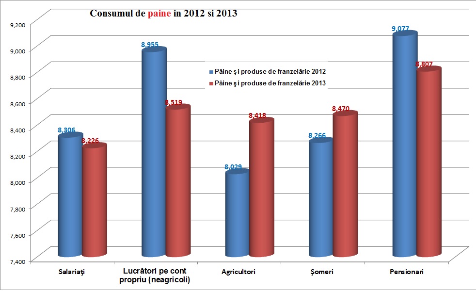 Consumul mediu lunar de paine a fost de 8,50 kg/persoana, insemnand anual 102 kg/persoana. Consumul cel mai scazut de paine s-a inregistrat la gospodariile de salariati (8,23 kg/persoana). Se observa-noteaza statisticienii- manifestarea uneia dintre legitatile consumului, conform careia de la un anumit nivel consumul de produse din cereale scade, fiind substituit cu alte alimente cu valoare nutritiva mai mare.