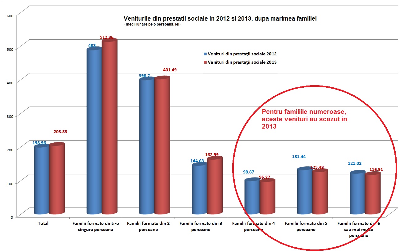 - 1. Veniturile din prestatii sociale si pensii au scazut in cazul familiilor numeroase