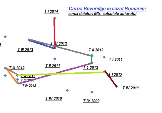 Se vede ca in ultimul trimestru din 2013 (ca si in aceeasi perioada a lui 2012, ca sa dau doar doua exemple), orientarea curbei indica probleme structurale „traduse” printr-o totala nepotrivire a politicilor publice in privinta stimularii intalnirii intre cererea si oferta de munca.