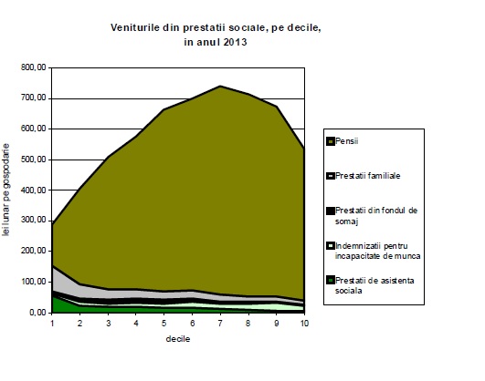Nici modul in care sunt gandite prestatiile sociale nu ajuta ocupantii pietei muncii. Nivelul mediu al prestatiilor sociale a inregistrat o tendinta de crestere de la o decila la alta pana la cea de-a saptea (unde a fost de 2,6 ori mai mare decat in prima decila) dupa care descreste. Aceasta tendinta este determinata de distributia pe decile a diferitelor categorii de pensionari. Impreuna cu veniturile din prestatii sociale, veniturile totale pe persoana ale familiilor din decila D10 au fost de 7,7 ori mai mari decat ale celor din decila D1, fara ele raportul dintre veniturile celor doua decile fiind de 9,0 : 1.