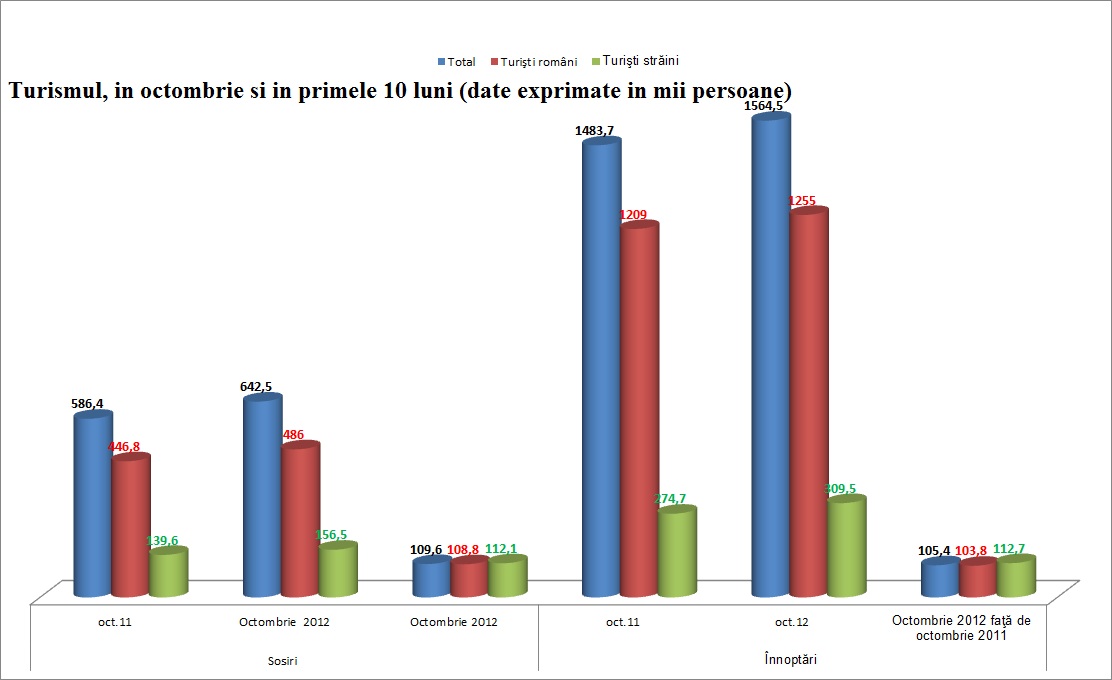 Fata de perioada 1.l-31.X.2011, sosirile in hoteluri in perioada 1.l-31.X.2012, sunt in crestere cu 8,6%. Innoptarile inregistrate in structurile de primire turistica in perioada 1.l-31.X.2012 au insumat 16771,1 mii, in crestere cu 7,6% fata de cele din perioada 1.l-31.X.2011. Innoptarile turistilor romani in structurile de primire turistica cu functiuni de cazare au reprezentat in perioada 1.l-31.X.2012 82,8% din numarul total de innoptari, in timp ce innoptarile turistilor straini au reprezentat 17,2%.