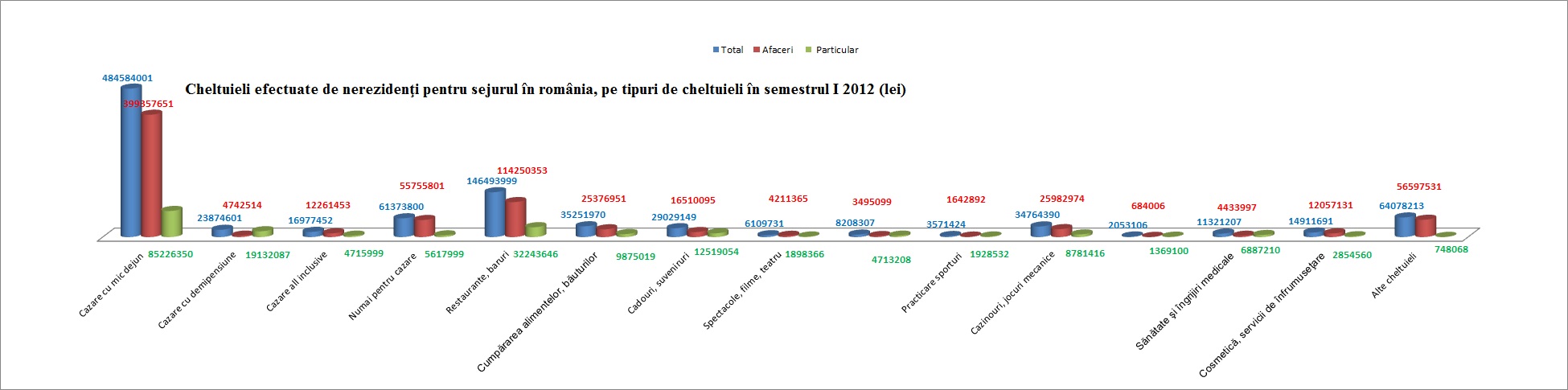 Dintr-un grup de 100 de turisti straini, 65 sunt veniti in scop de afaceri sau participare la congrese (targuri, expozitii) iar 35 sunt veniti in scop particular. Din aceasta ultima categorie, a celor veniti cu scopuri private, majoritatea sunt in vizita la rude sau prieteni. Businessul mare, banii pe care strainii ii cheltuie in tara noastra adica, vin de la turistii aflati in scopuri de business (80% din bani). Ponderea cea mai mare o reprezinta cheltuielile pentru cazare (59,7%). In restaurante, strainii isi lasa 15% din banii cheltuiti in Romania, iar pentru cumparaturi au rezervati putin peste 7% din buget. Jumatate din ceea ce ramane sunt cheltuiti pe distractie, in cazinouri ori jocuri de noroc.