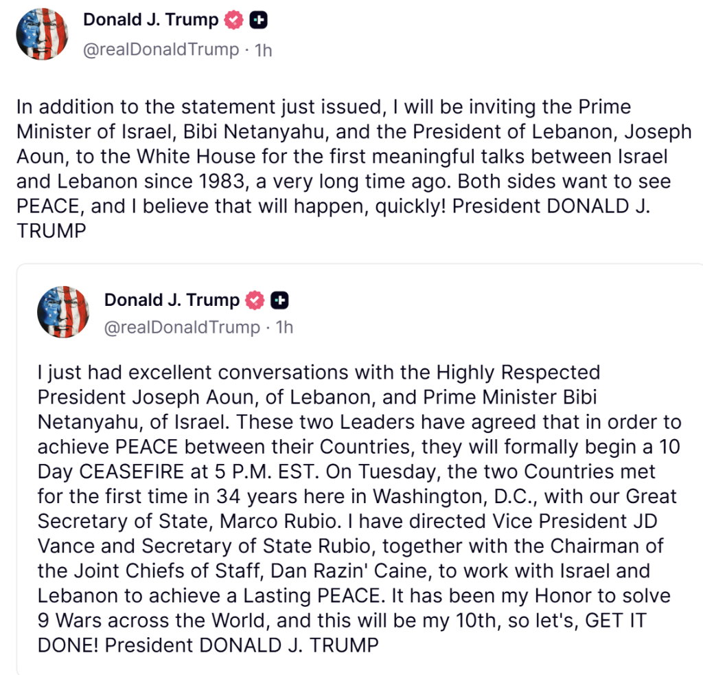 Donald Trump a făcut acest anunț într-o postare pe plarforma sa Truth Social. În mesaj, Trump spune că liderii israelian şi libanez au fost de acord cu un armistiţiu de 10 zile, cu începere de la ora locală 17:00 (21.00 GMT, miezul nopții în România).