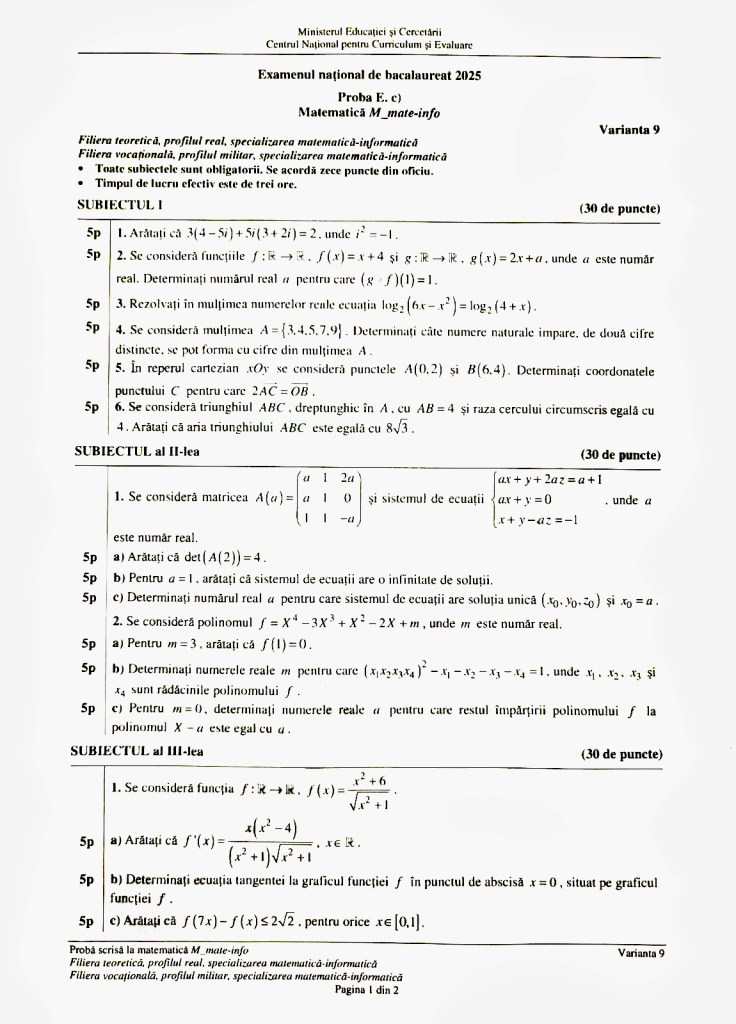 UPDATE: Subiectele la Matematică BAC 2025, profilul real, specializarea Matematică-Informatică, sesiunea august, au fost publicate de Edupedu.ro. Varianta extrasă a fost cea cu numărul 9: