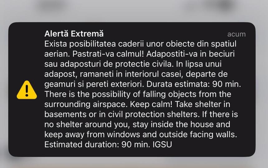 „În urmă cu scurt timp, Inspectoratul General pentru Situaţii de Urgenţă a emis un mesaj de tip RO-Alert pentru zona de Nord a judeţului Tulcea prin care informează locuitori despre posibilitatea căderii unor obiecte din spaţiul aerian. Acest mesaj este trimis după ce structurile cu rol de apărare a frontierelor au detectat posibile ţinte în apropiere de graniţele României”, a transmis ISU Tulcea.
