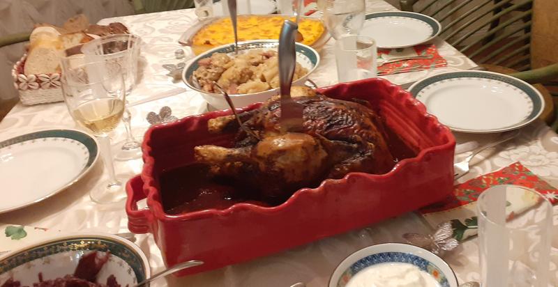 Lumea nu prea e de acord cu părerile mele libertine, strâmbă din nas. Ne așezăm din nou la masă, așteptând highlight-ul serii. Cu grijă, aproape ritualic, claponul în sos de vin și în vasul cel roșu, de ceramică, e așezat la mijlocul mesei. Vive le Coq Roi! Se taie și se așează în farfuriile tuturor. Eu am parte de o pulpă delicioasă, cu garnitură diversă. Am parte și de vin, care curge gârlă în pahare. Musafirii sunt încântați, nu mai prididesc cu laude la adresa franțuzoaicei și a soțului ei, în fapt artizanul măreței realizări. Se bea, se savurează desertul, se mai povestește la o țigară sau o lulea, pe terasă.