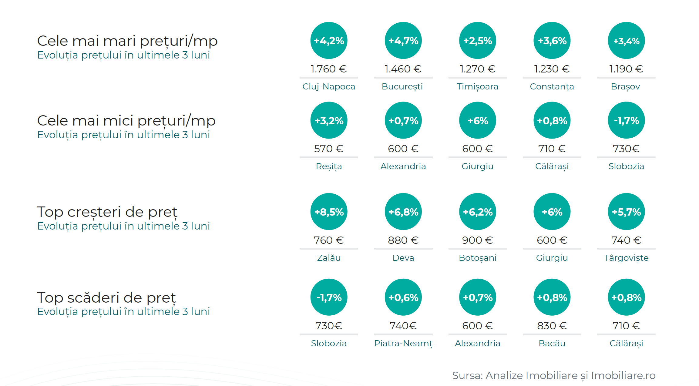 Clasamentul celor mai mici variații de preț este completat de Piatra Neamț, unde apartamentele s-au scumpit cu 0,6%, pâna la 740 de euro pe metru patrat util; capitala județului Neamț este urmata de Alexandria, cu un plus de 0,7% la trei luni (pâna la 600 de euro pe metru patrat util), de Bacau (+0,8%, pâna la 830 de euro pe metru patrat util), dar și de Calarași (+0,8%, pâna la 710 euro pe metru patrat util).