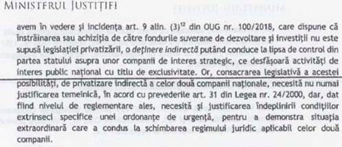 Ministerul Justiției consideră că este necesară completarea normelor cu modalitățile în care deținerea directă sau indirectă a capitalului social de către stat se poate manifesta. Ministerul Justiției spune că are în vedere și prevederile din OUG 100/2018 privind înființarea fondurilor suverane, care prevăd că înstrăinarea sau achiziția de către un fond nu se supun legislației privind privatizarea societăților. Astfel, o deținere indirectă ar putea conduce la lipsa de control din partea statului asupra unor companii de interes strategic. Consacrarea legislativă a acestei posibilități, de privatizare indirectă a celor două companii naționale, necesită o justificare temeinică și explicarea situației extraordinare care a condus la schimbarea regimului juridic aplicabil celor două companii.