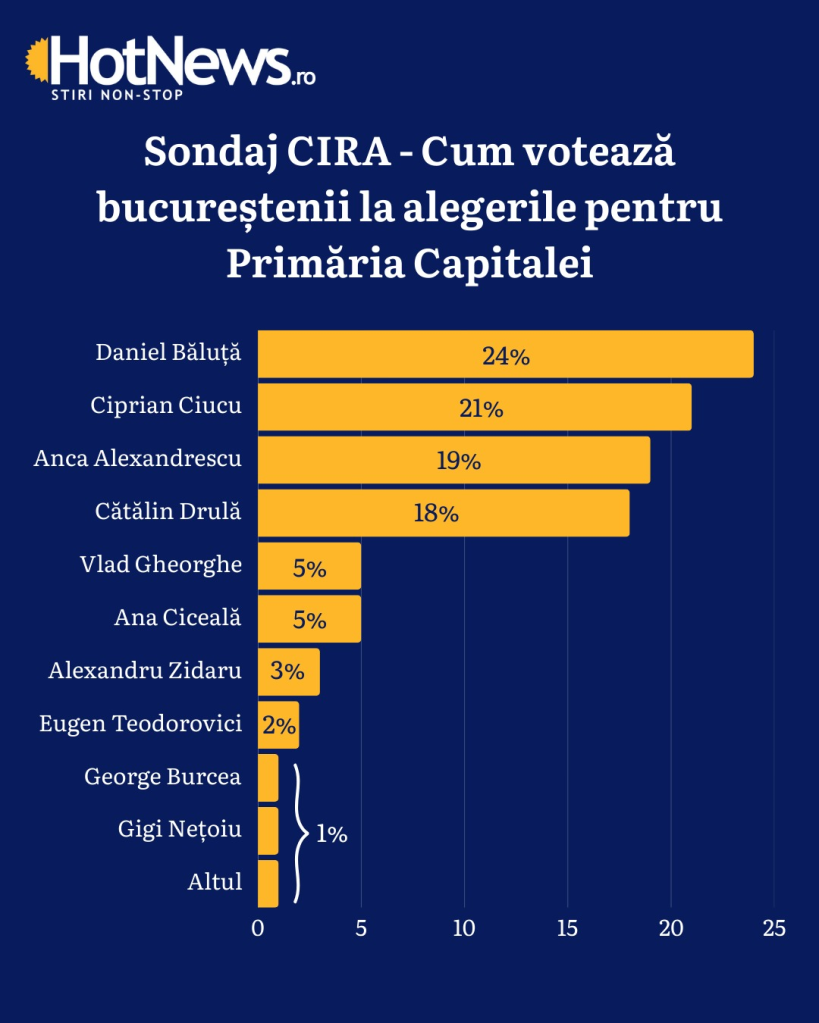 Candidatul independent la Primăria București Vlad Gheorghe a publicat vineri un nou sondaj, realizat de casa de sondare CIRA. Primul în intenția de vot pentru București este Daniel Băluță – 24% (PSD), urmat de Ciprian Ciucu – 21% (PNL) și Anca Alexandrescu – 19% (susținută de AUR).