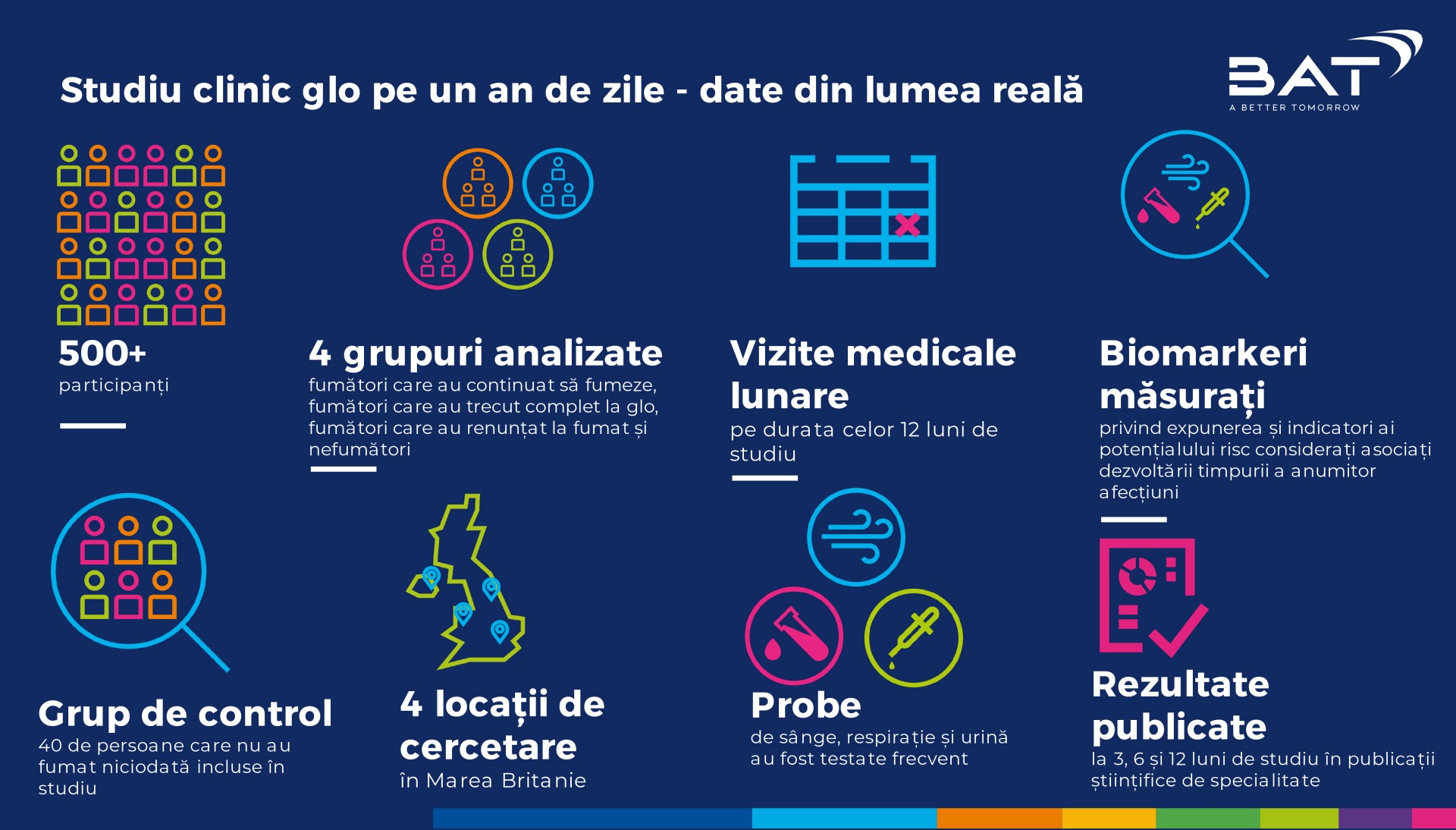 Rezultatele complete ale unui studiu efectuat pe durata unui an de zile arată că fumătorii care au trecut exclusiv la glo, cel mai inovator produs din portofoliul BAT care încălzește, nu arde tutunul, au obținut îmbunătățiri semnificative și susținute în privința mai multor indicatori de potențial de risc asociat dezvoltării timpurii a unor afecțiuni (între care boli pulmonare, cancer și boli cardiovasculare), în comparație cu cei care au continuat să fumeze.